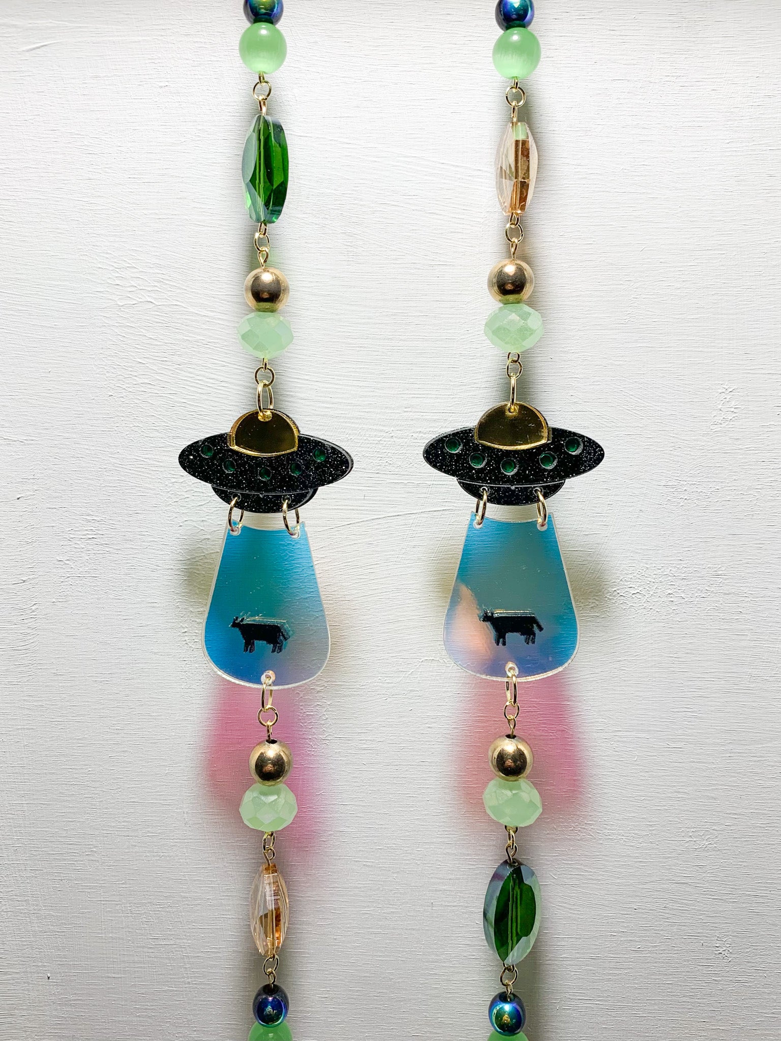 Hover responsibly this celestial season! These space ships are one sided but have been strung in a way that they should behave themselves and face forward when worn <3