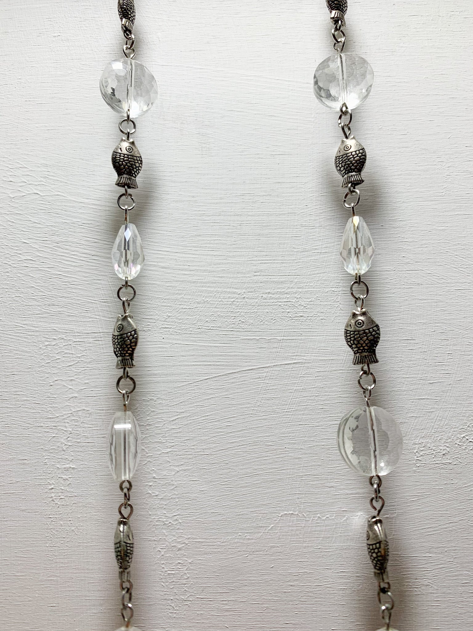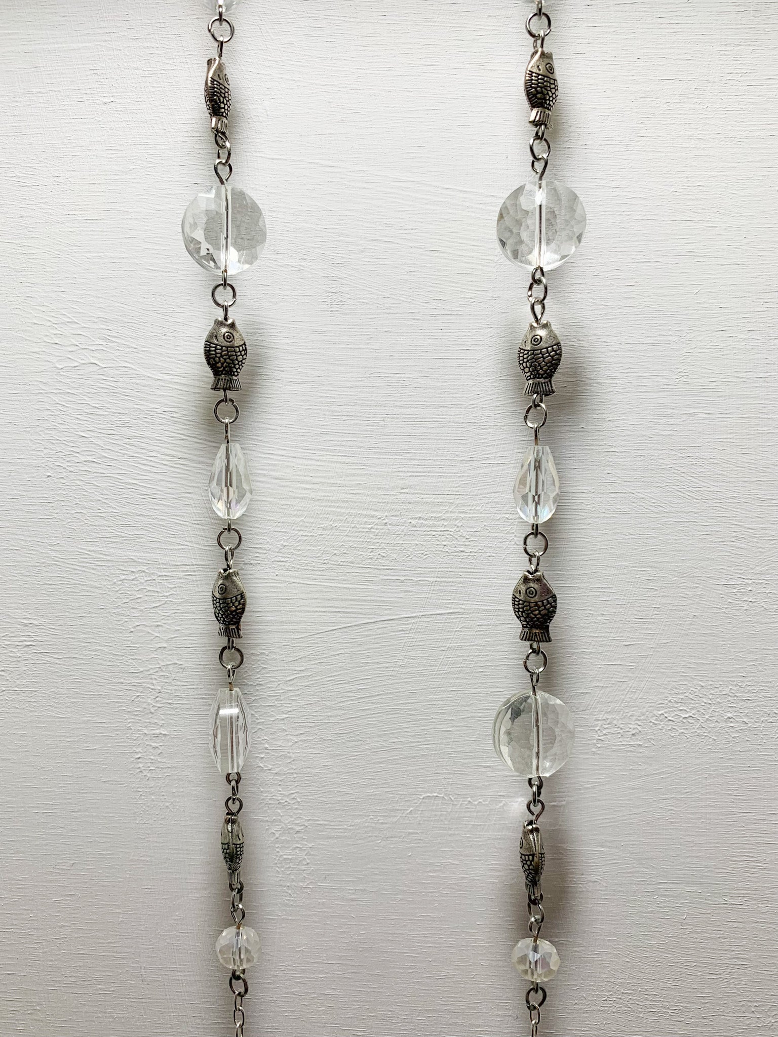 These fishy features will bounce and beam sunlight all around until dusk! These chains utilize glass and metal beads and you should see how playful those glass shapes are in the sunlight!
